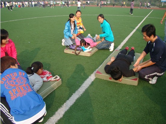 2010年10月20日上午9:00,在临江苑足球场内,伟德国际1949青年志愿者联合分会的所有成员正在练习按摩,“备战”新生运动会。
