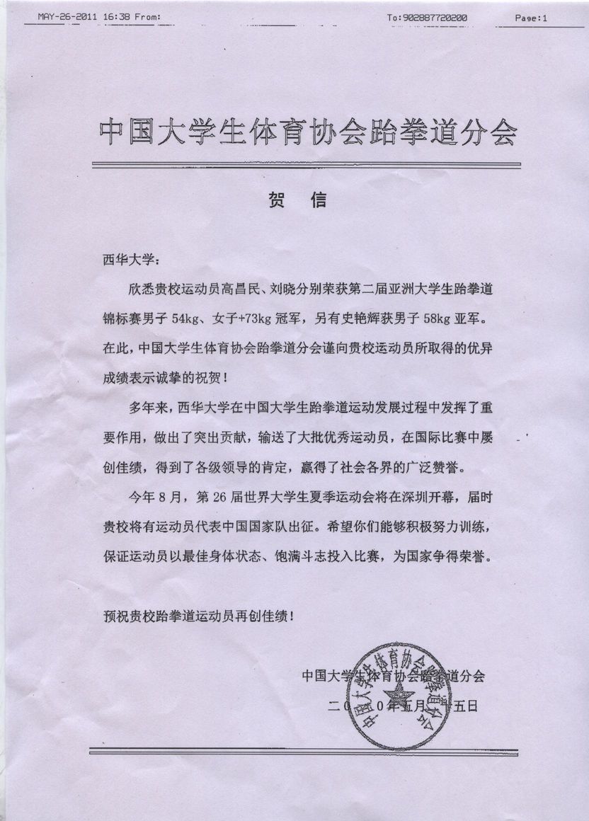 中国大学生体育协会跆拳道分会发来贺信,向我校取得的优异成绩表示诚挚的祝贺,对多年来学校在中国大学生跆拳道运动发展过程中作出的突出贡献表示肯定,并预祝我校运动员即将在深圳举行的第26届世界大学生夏季运动会上取得更加优异的成绩。
