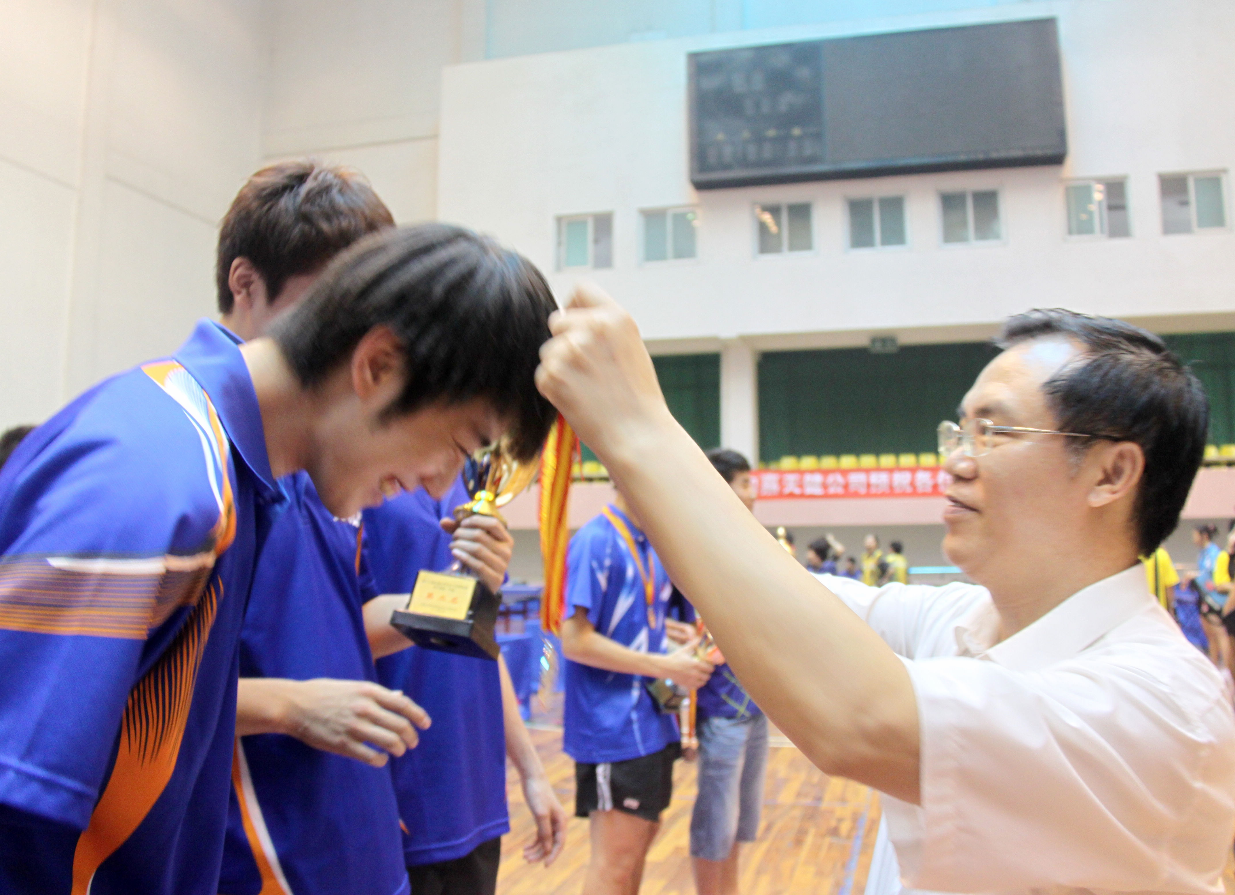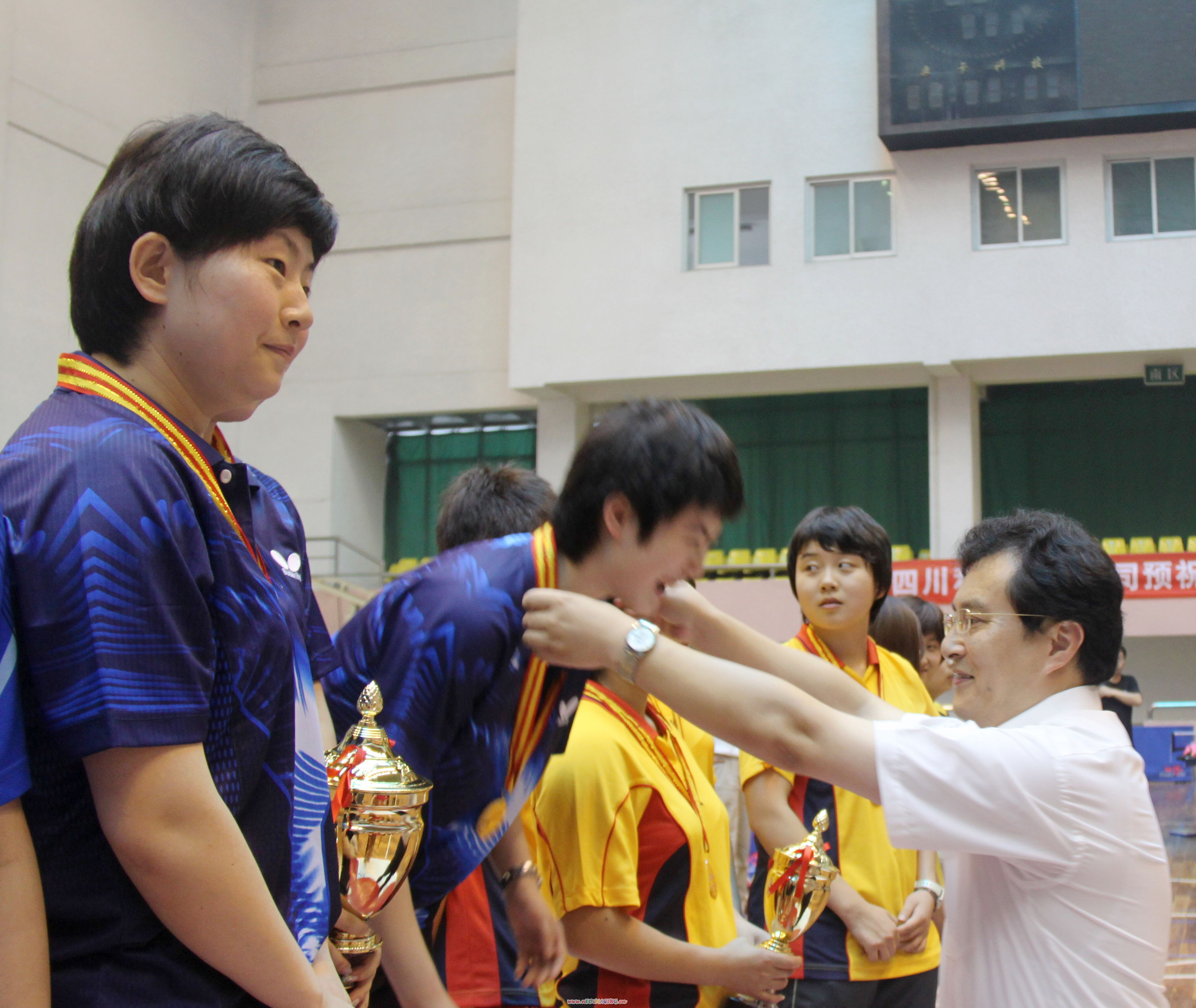 中国大学生体育协会乒乓球分会副主席何建平为甲组男团前三名颁奖