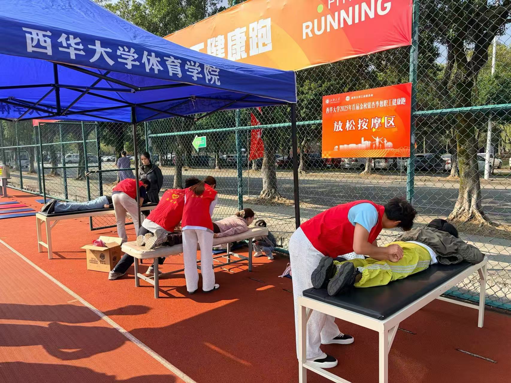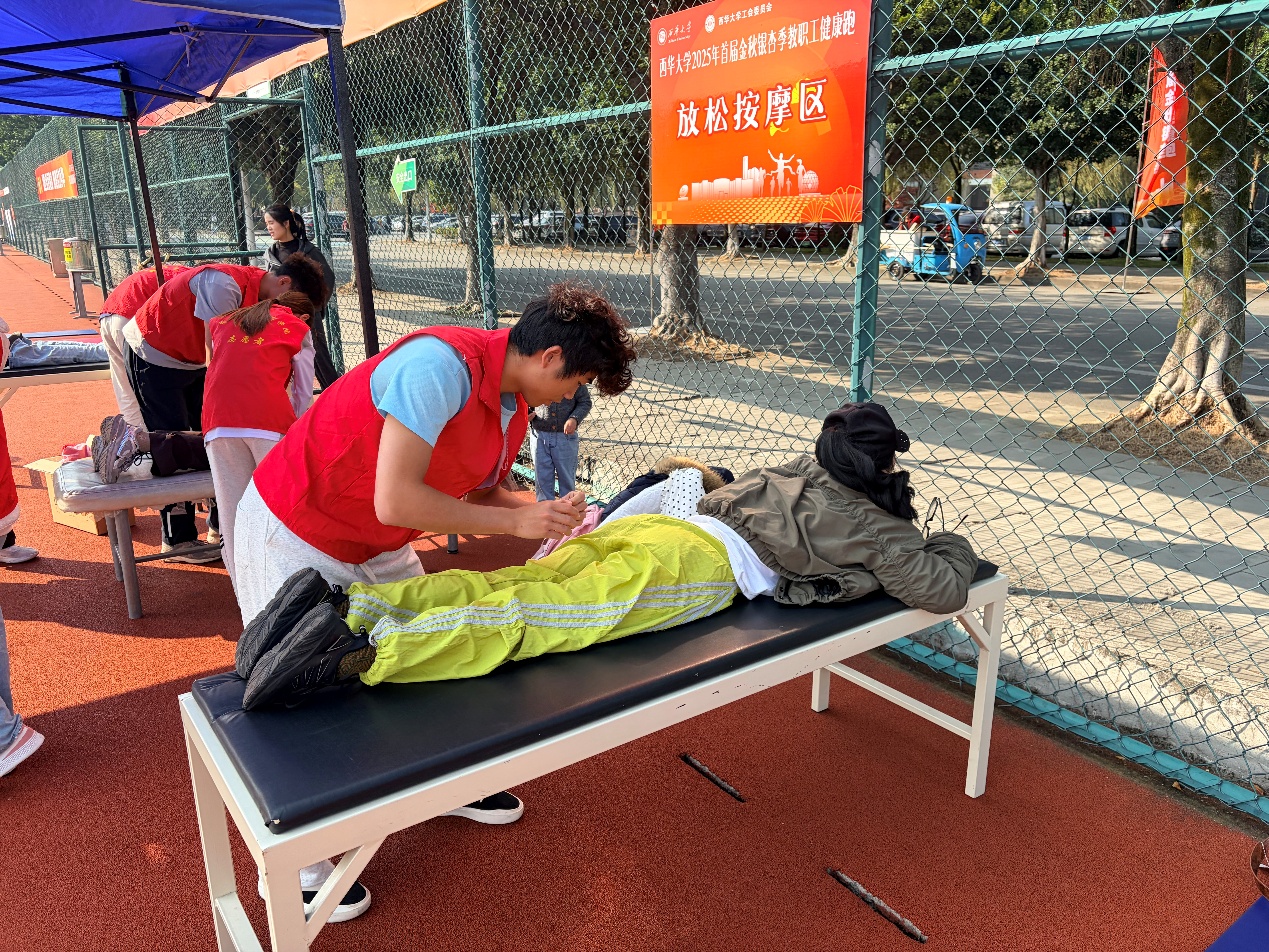 活动当日,经过培训的志愿者们以饱满的热情和专业的技能投入服务。他们在指定区域为完赛的老师们提供了细致、耐心的放松按摩,帮助老师们缓解运动后的肌肉紧张与疲劳。志愿者们规范的操作、亲切的交流,不仅赢得了老师们的一致赞誉,更在实践中深化了对课堂所学理论知识的理解与应用,展现了体院学子良好的精神风貌与专业素养。