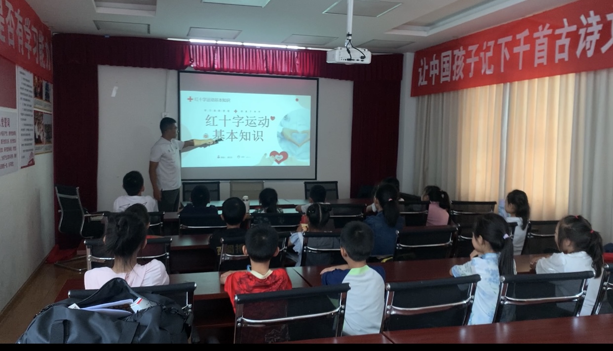 实践团以动画视频和趣味问答的形式,向孩子们讲解了“人道、博爱、奉献”的红十字精神,并结合夏季防火重点,科普了火灾逃生技巧、灭火器使用等消防安全知识。“电器着火能不能用水浇?”“逃生时要捂住哪里?”孩子们争相举手回答,现场气氛热烈。宣讲员李佳川同学表示:“看到孩子们能准确说出‘趴低身子、湿毛巾捂口鼻’这样的细节,我们特别有成就感。”宣讲中还融入了中华传统美德教育,通过讲述古代医者“悬壶济世”、邻里互助的故事,让孩子们理解“仁者爱人”的文化内涵,增强社会责任感和互助精神。