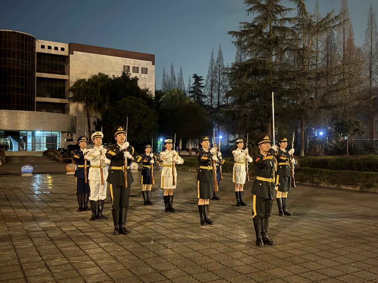 天色初明,校园仍浸润在宁静之中,体院学子们已身着统一服装,精神抖擞列队整齐,目光专注地望向国旗即将升起的方向。伴随铿锵有力的步伐,学校国防特勤大队国旗护卫队队员昂首挺胸,护卫着鲜艳的五星红旗自广场东侧稳步前行,“一二三四”的嘹亮口号穿透晨雾,彰显青春担当。行至升旗台前,方队利落转身,升旗手郑重接旗、固定,动作规范严谨、一丝不苟。