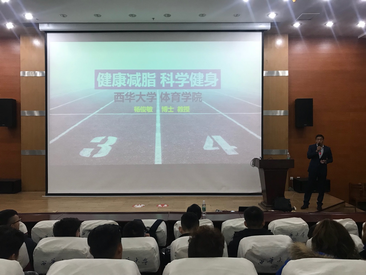12月4日晚上19:00,体育学院西华讲堂——“健康减脂、科学健身”在图书馆报告厅二厅成功举行,体育学院杨俊敏教授应邀作为主讲人。体育学院党委副书记兼副院长钟灵波,辅导员魏崧丞、罗小青和部分学院师生代表参加了本次讲座,2016级辅导员魏崧丞主持本次讲座。
