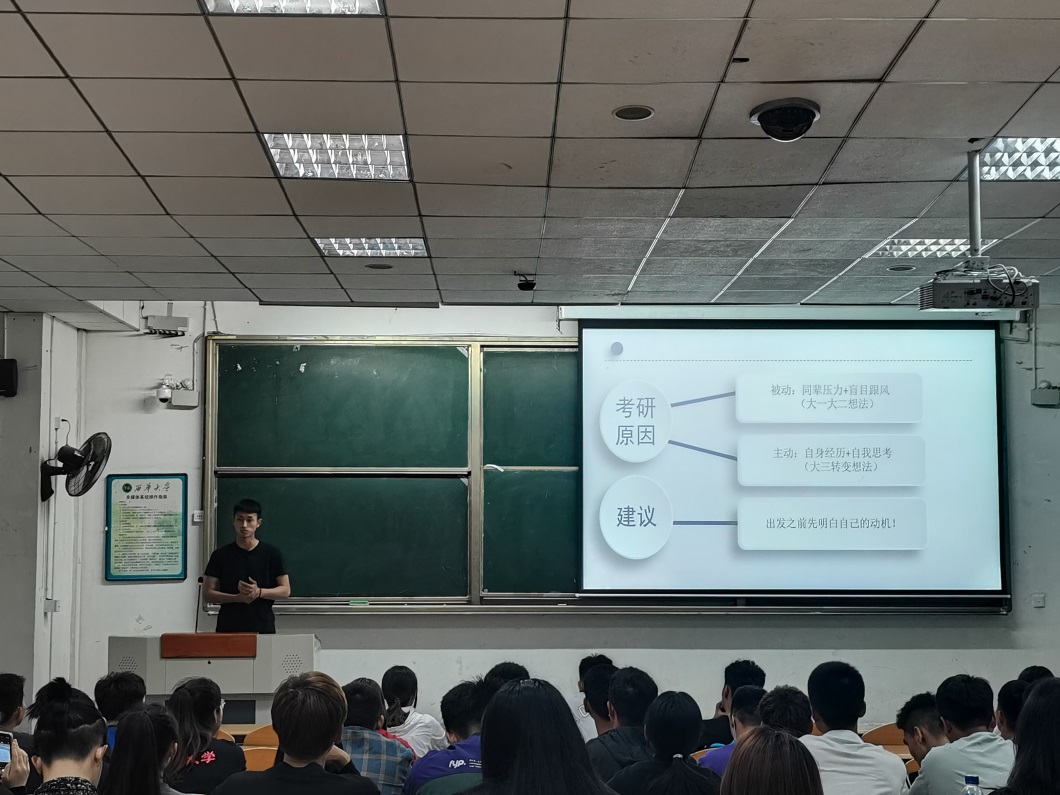 2017级考取研究生的肖孟琦、詹理正、周川、张华四位学生从推免程序、推免材料准备、学校选择、考研各科的复习方法、考研信心的树立、备考心态的调整、考证与考研的关系、学校课程与考研的关系等方面向与会同学分享了他们的心路历程。2019级研究生冯敬则从研究生的学习生活以及自己在参与大运会筹备工作期间的感受向同学们进行了分享,鼓励大家积极考研,提升自身能力。几位同学通过自身经验分享鼓励低年级的学弟学妹们要脚踏实地学好知识,不要急于从事社会兼职,要及早明确目标,注重课外相关知识的涉猎和储备,提升自身的综合素质。